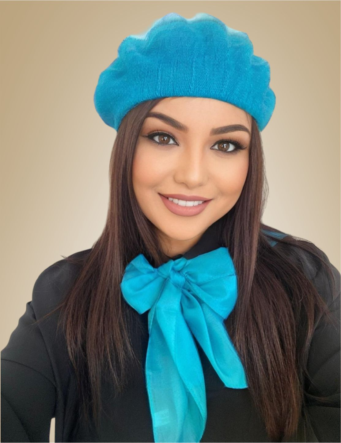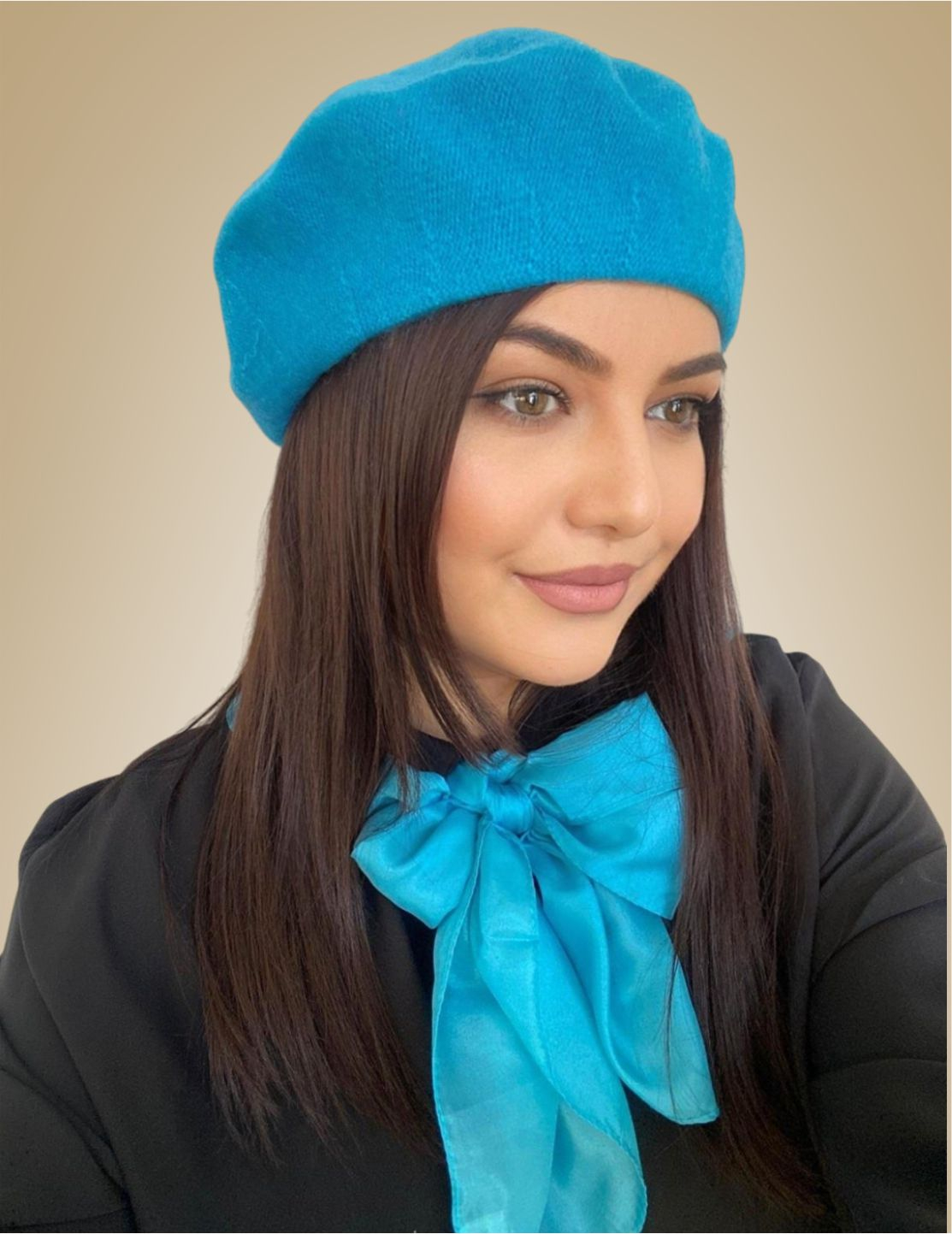 Setul contine 1 bereta frantuzeasca 100% lana + 1 esarfa de matase asortata de 60x60 cm