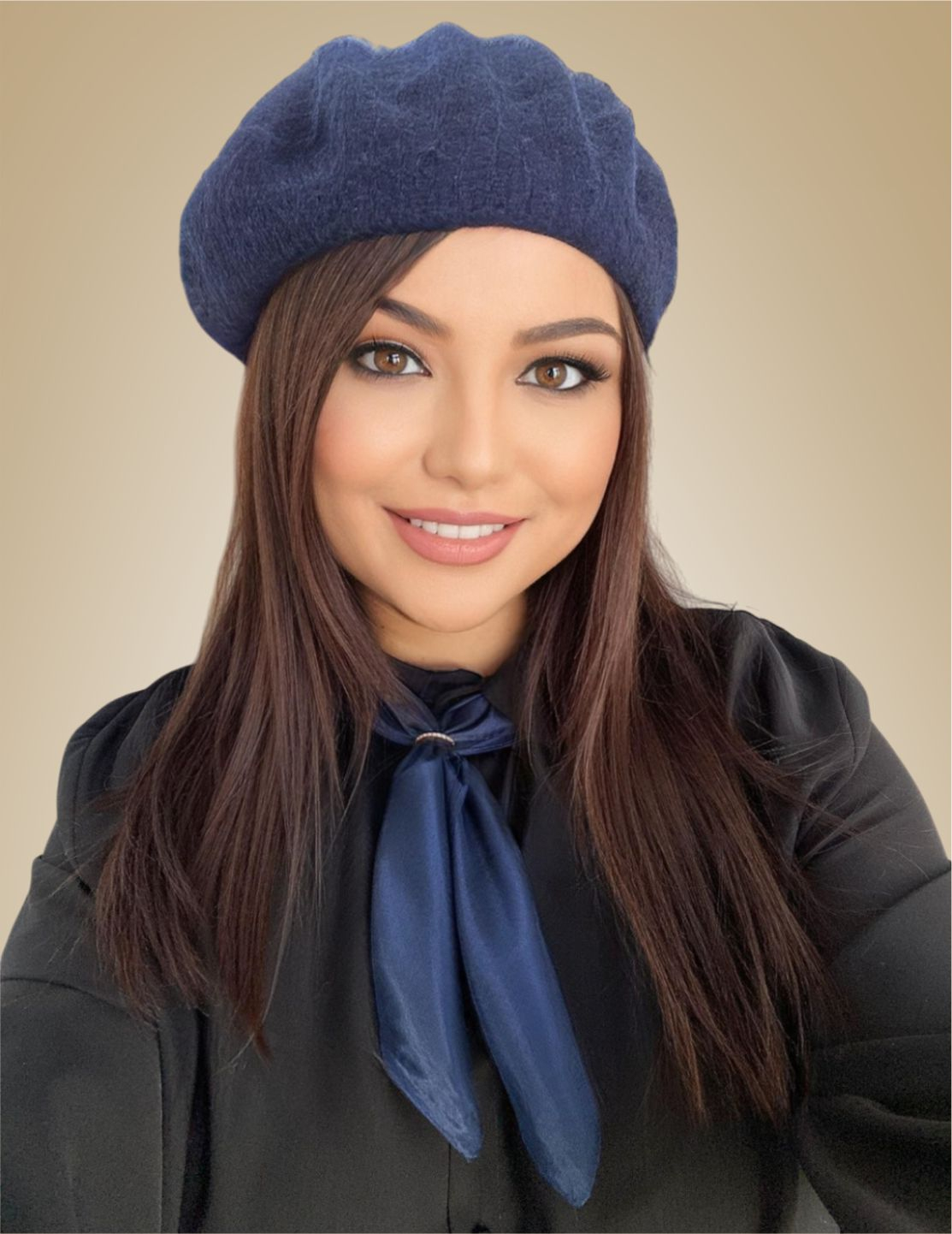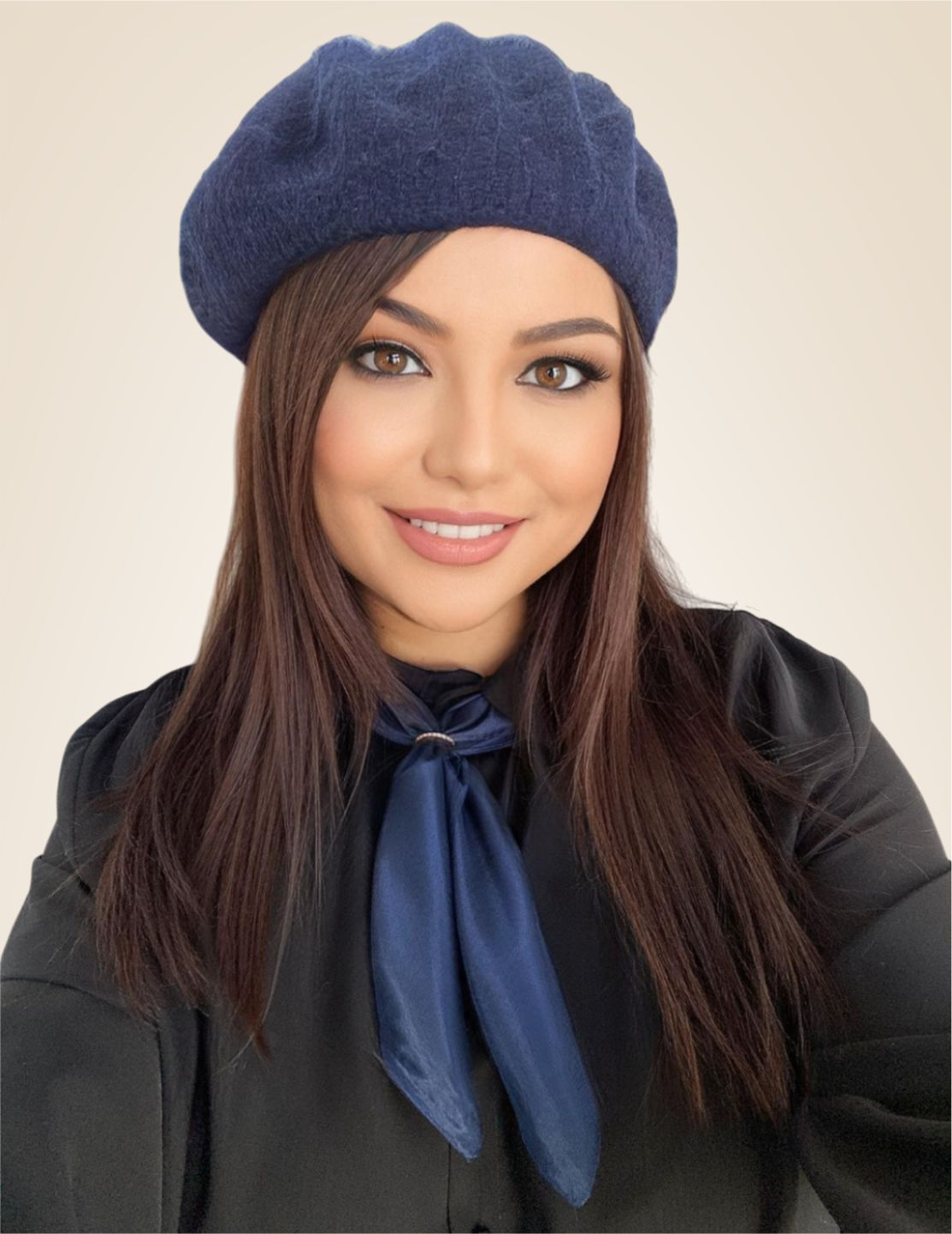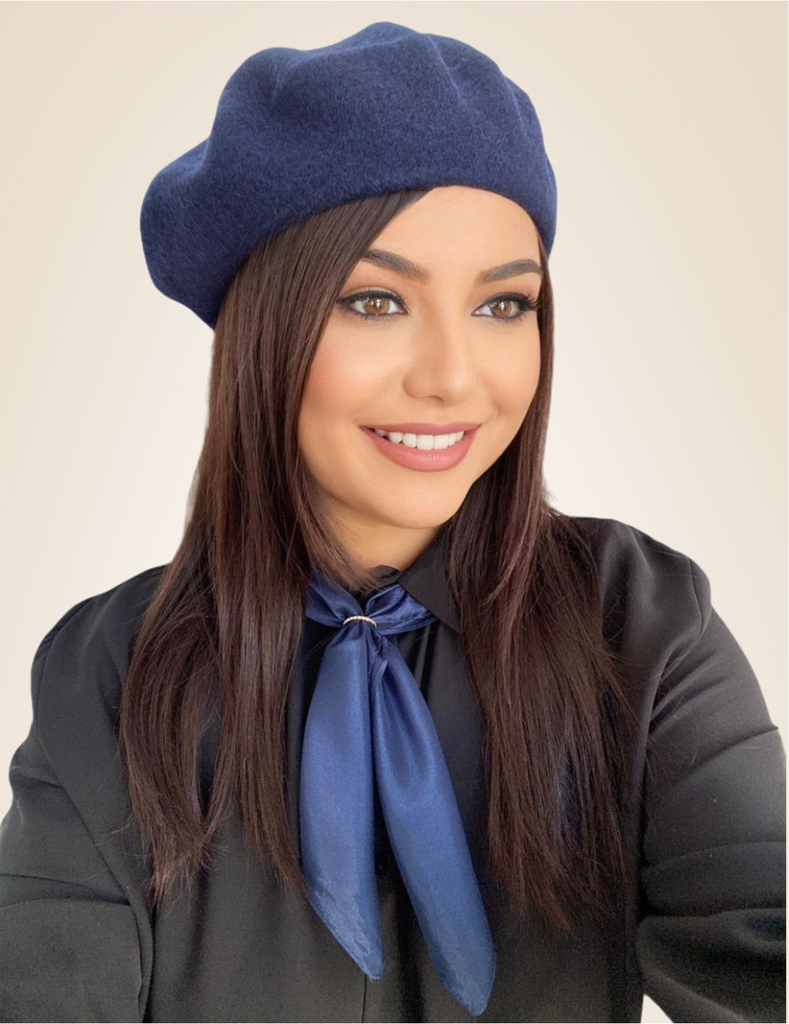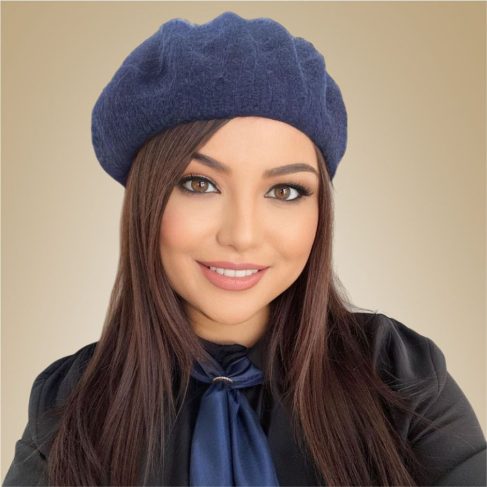 Setul contine 1 bereta frantuzeasca 100% lana + 1 esarfa de matase asortata de 60x60 cm