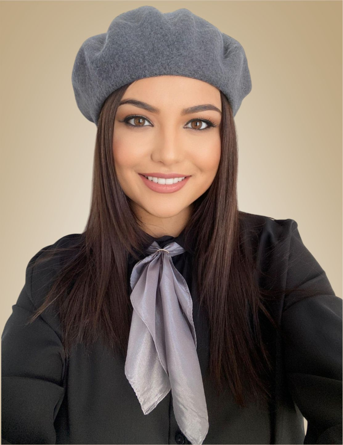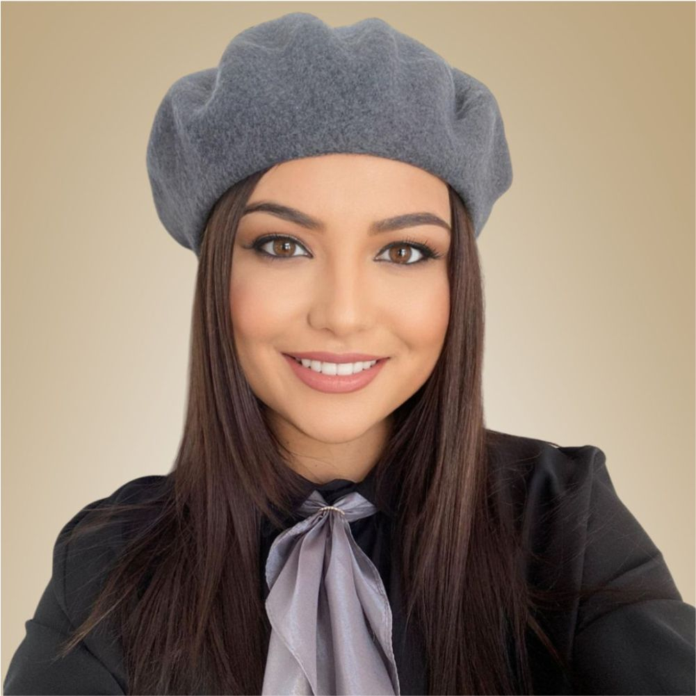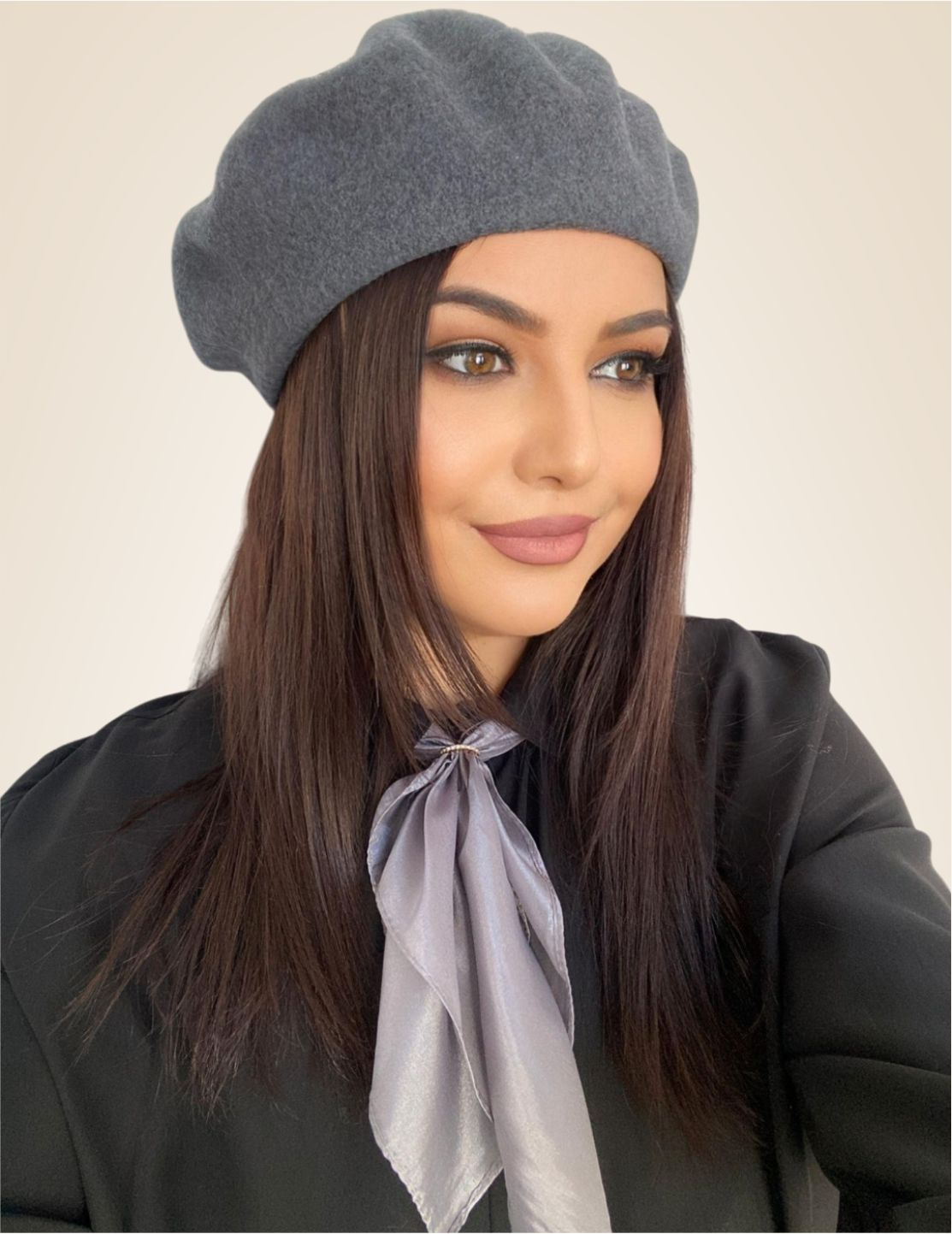 Setul contine 1 bereta frantuzeasca 100% lana + 1 esarfa de matase asortata de 60x60 cm