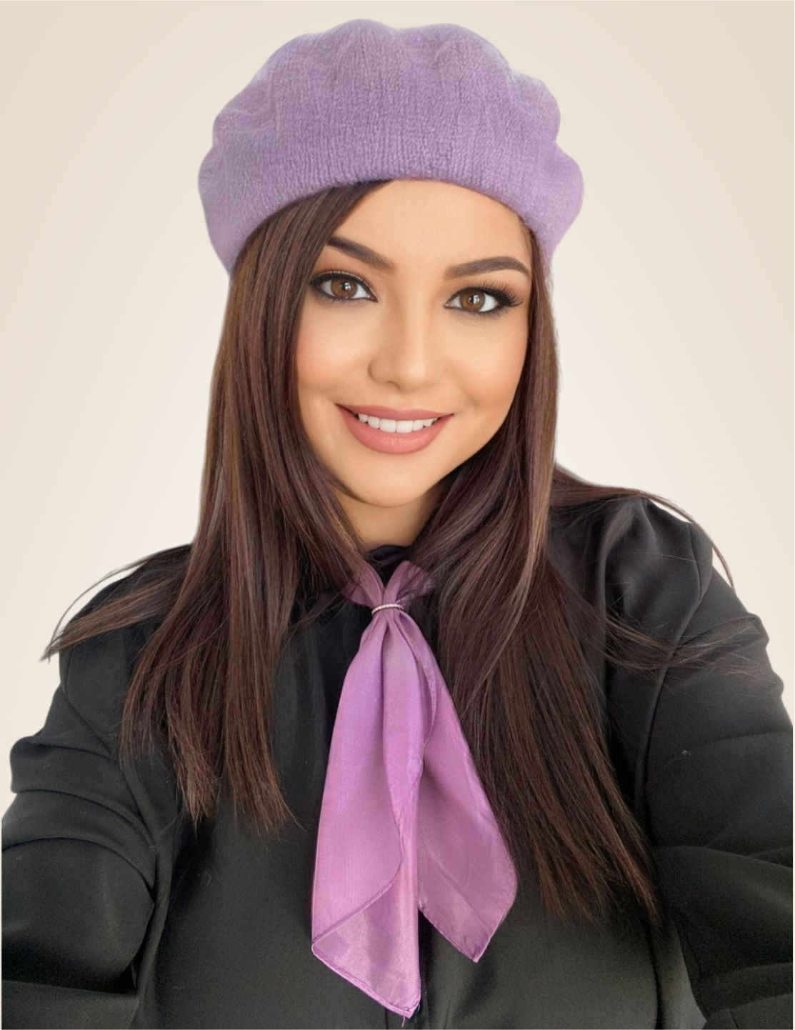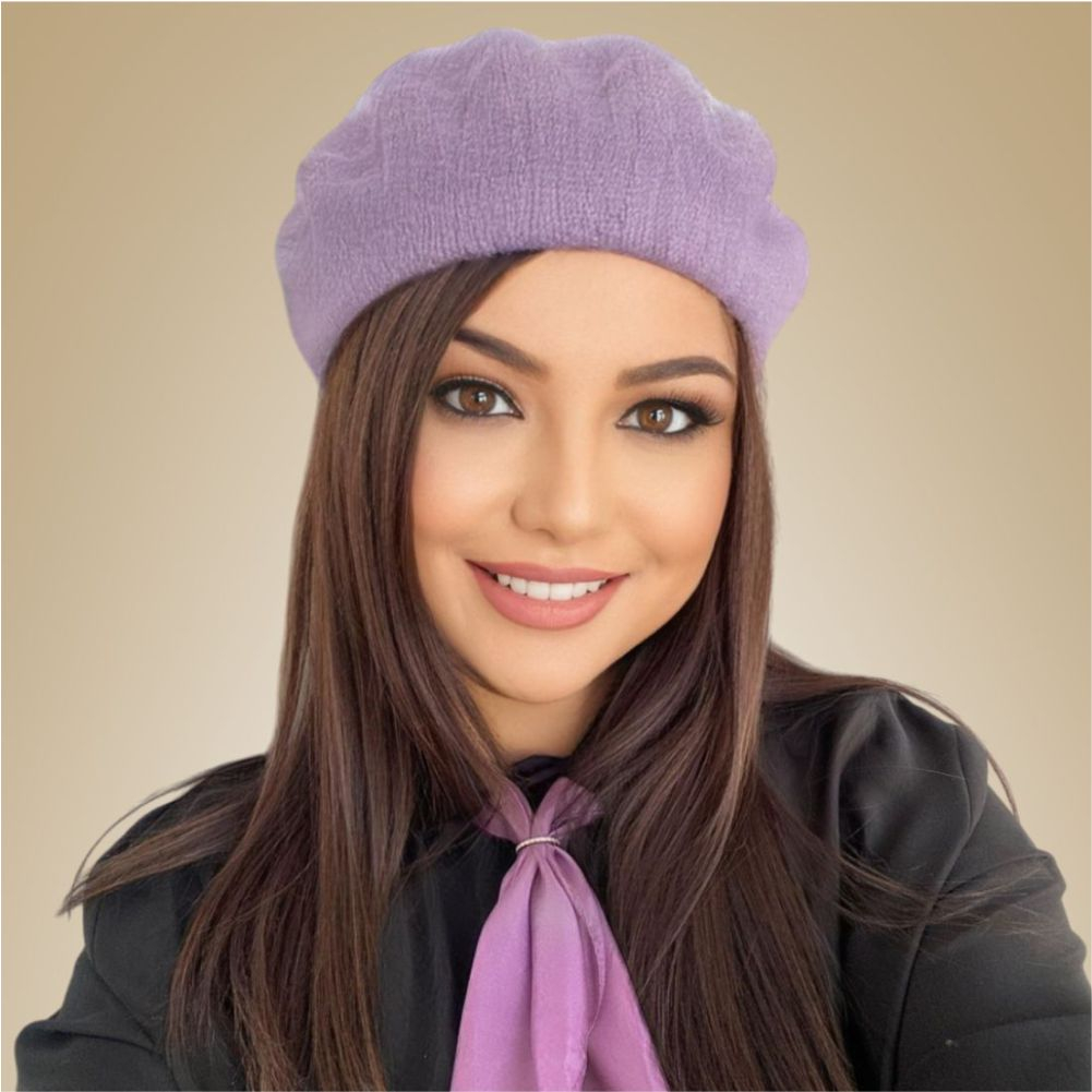 Setul contine 1 bereta frantuzeasca 100% lana + 1 esarfa de matase asortata de 60x60 cm