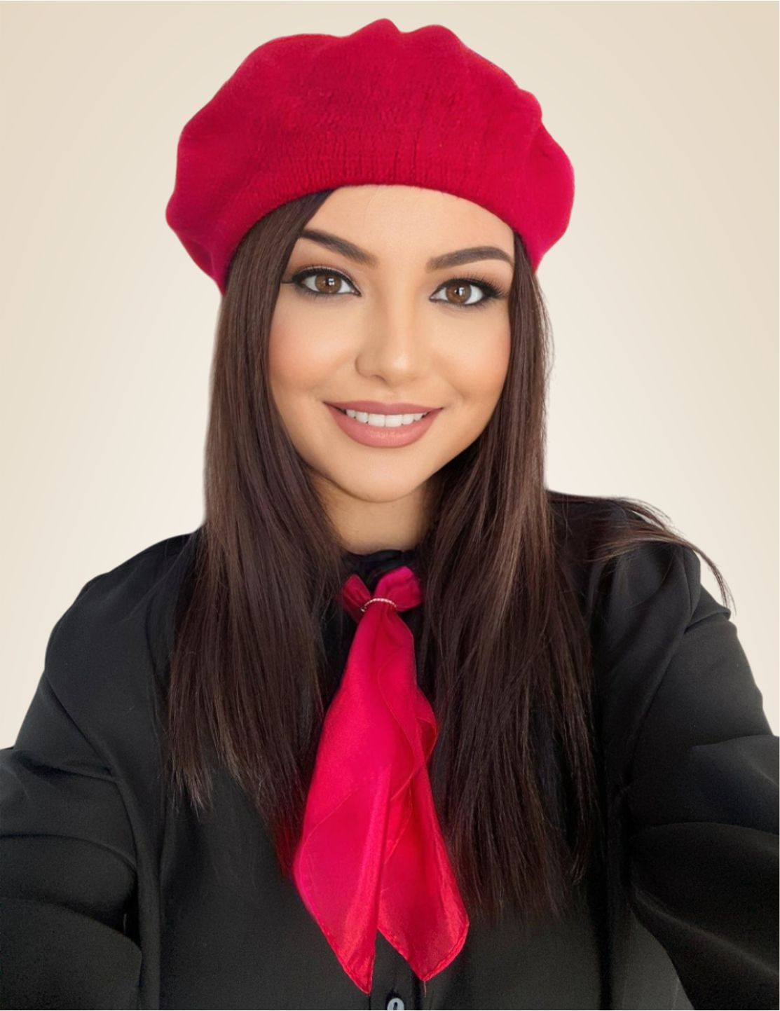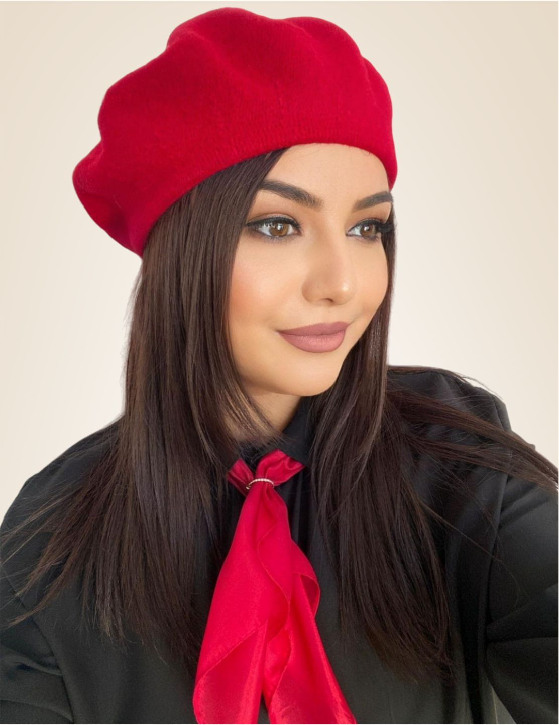 Setul contine 1 bereta frantuzeasca 100% lana + 1 esarfa de matase asortata de 60x60 cm