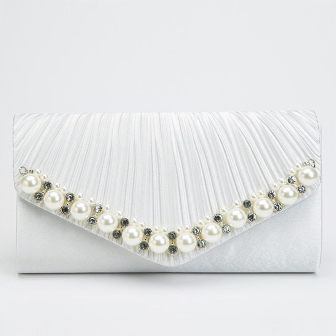 Geanta lux tip plic satinat cu perle si strasuri Lady Chic (ALB sidef)