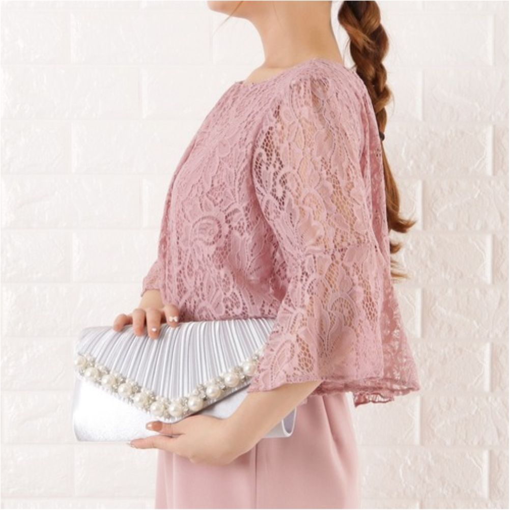 Model: geanta de dama de ocazie tip plic satinat accesorizata cu perle si strasuri