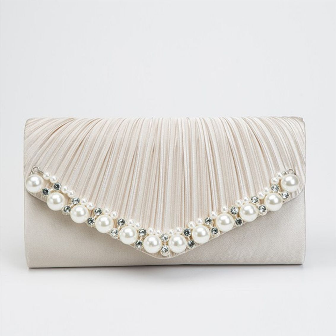 Geanta lux tip plic satinat cu perle si strasuri Lady Chic (BEJ sampanie)