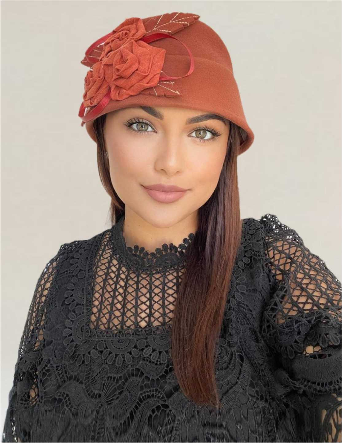 Si tu te poti bucura de o palarie de dama moderna alegandnoul model Ariana, o palarie tip tocadin fetru de calitate, fin si cu prestanta, cu croiala clasica tip clopot si decor rafinat cu flori stlizate, o palarie deosebit de eleganta, cu un nou design, la moda acum - marime unica, reglabila
