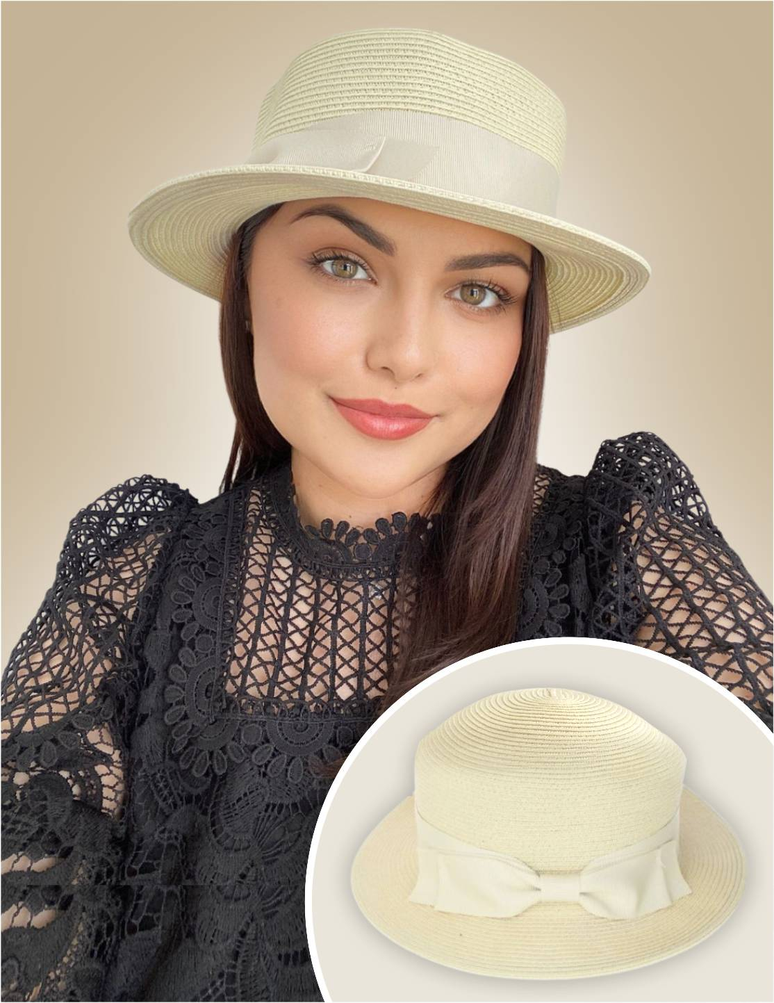 Și tu te poti bucura de o palarie de dama deosebit de rafinata alegand noul model de palarie de soare tip canotiera Zina Chic, o palarie de vară cu boruri mici și drepte într-o nuanta calda de bej, accesorizata cu banda textila si funda asortata. Designul rafinat o face ideala pentru zilele însorite de vara, evenimente estivale sau vacanțe relaxante. O palarie de dama clasica, ce imprima eleganta si rafinament oricarei tinute - mărime unică, reglabilă