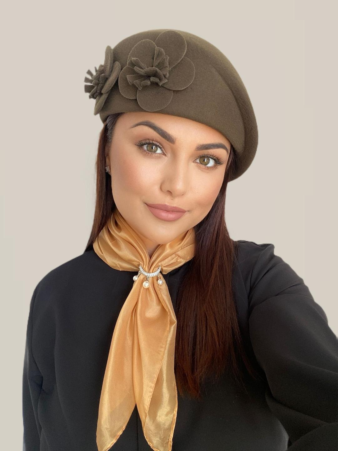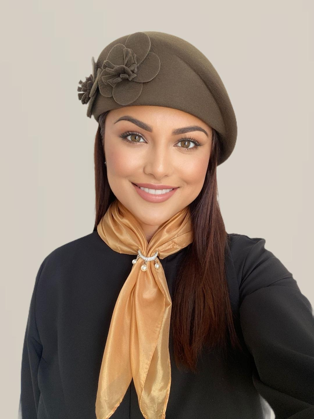 Palarie dama toca pe colt REGINA LUX + esarfa CADOU (KAKI) - marime unica, reglabila