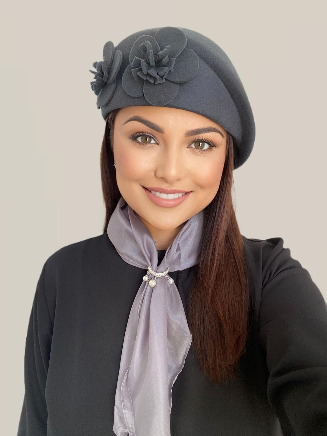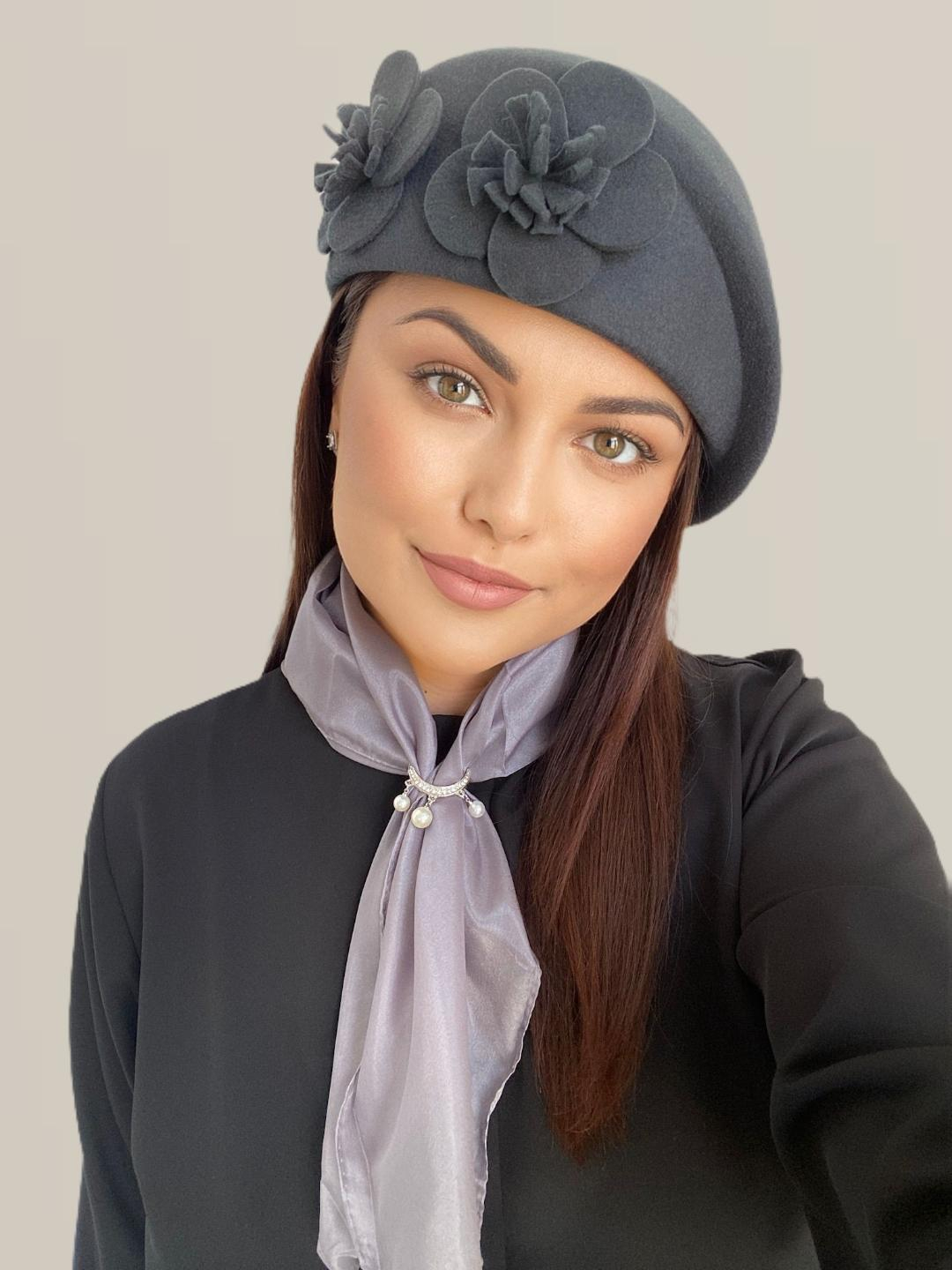 Palarie dama toca pe colt REGINA CHIC + esarfa CADOU (GRI) - marime unica, reglabila