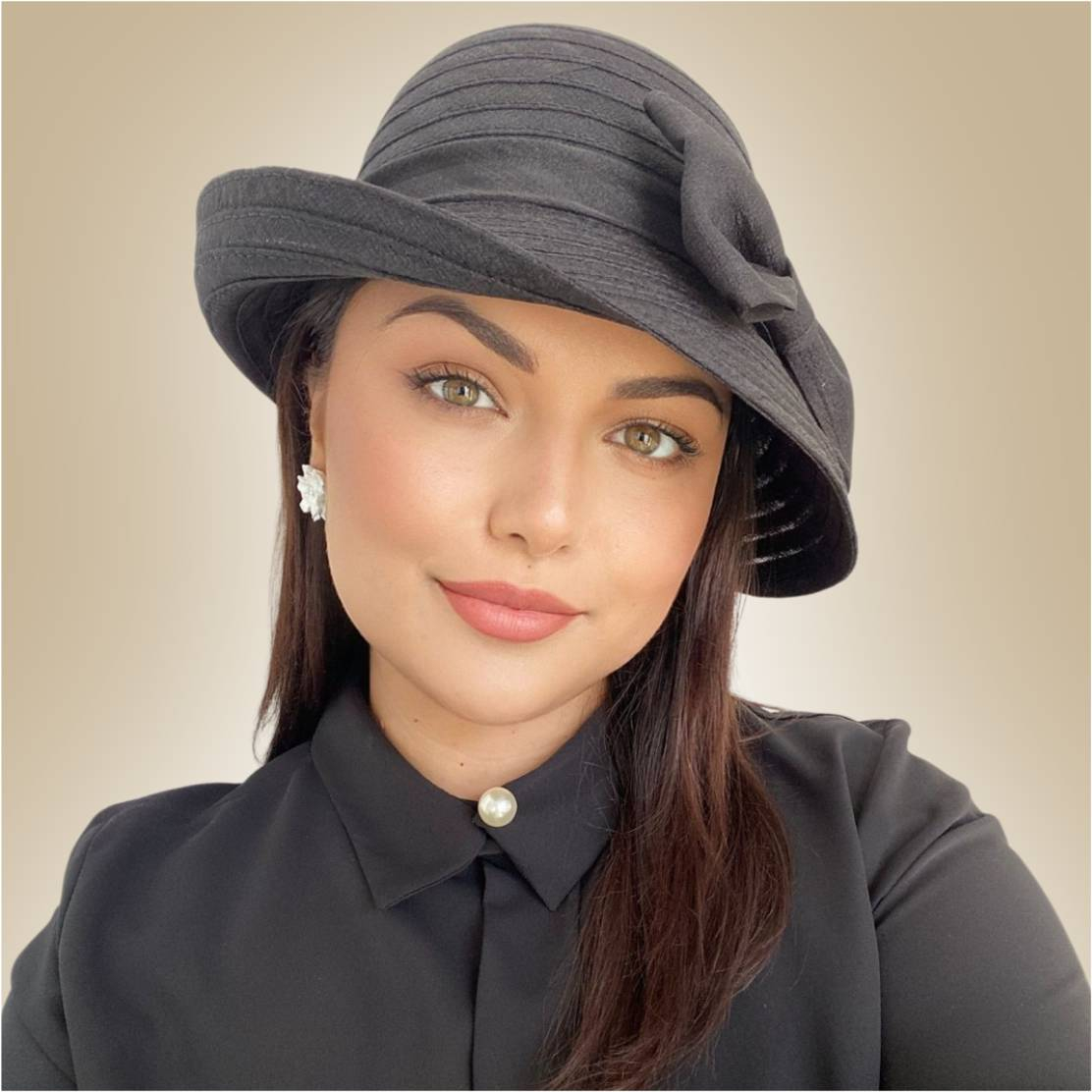 Accesorizare: palarie de dama cu decor rafinat din funda asortata, asezata lateral
