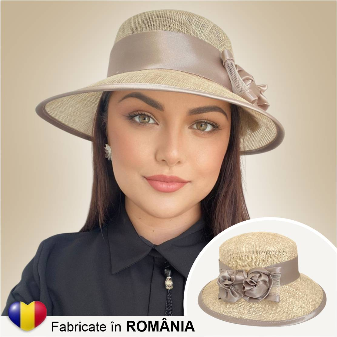 • Accesorizare: palarie de dama cu decor luxuriant cu panglica din satin de jur imprejur si 2 trandafiri stilizati din satin, asezati lateral