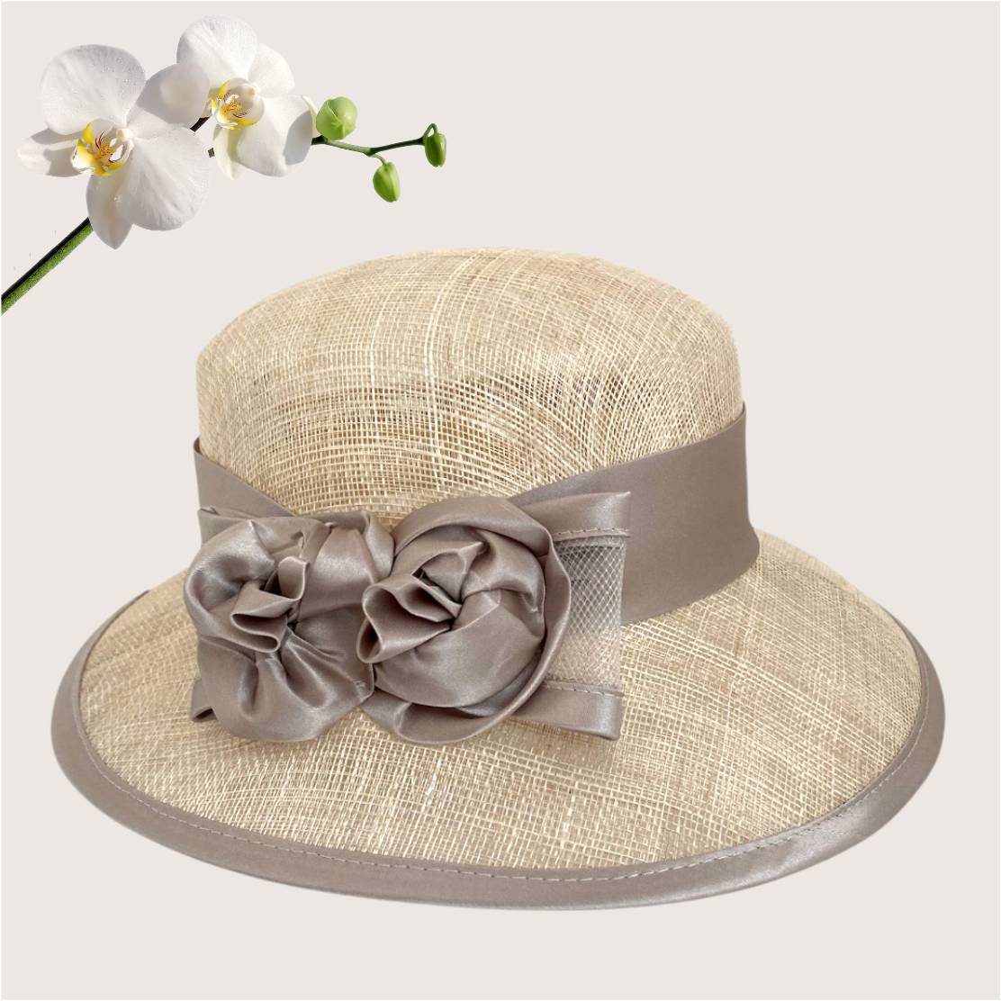 Palarie soare de lux din sisal cu trandafiri din satin LADY ROSE LUX (CREM) - marime unica, reglabila
