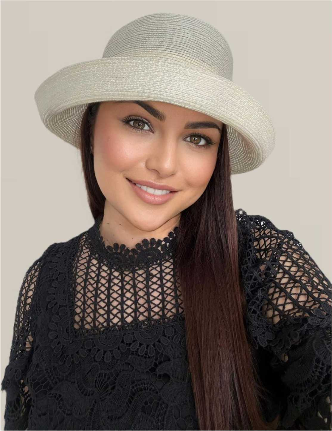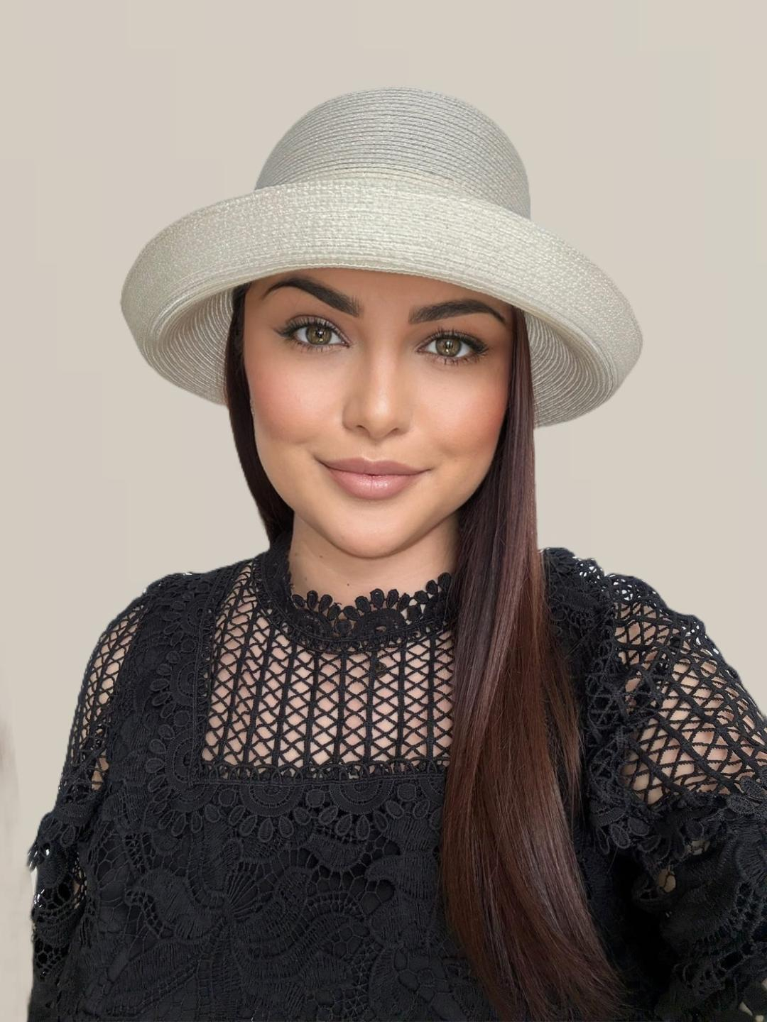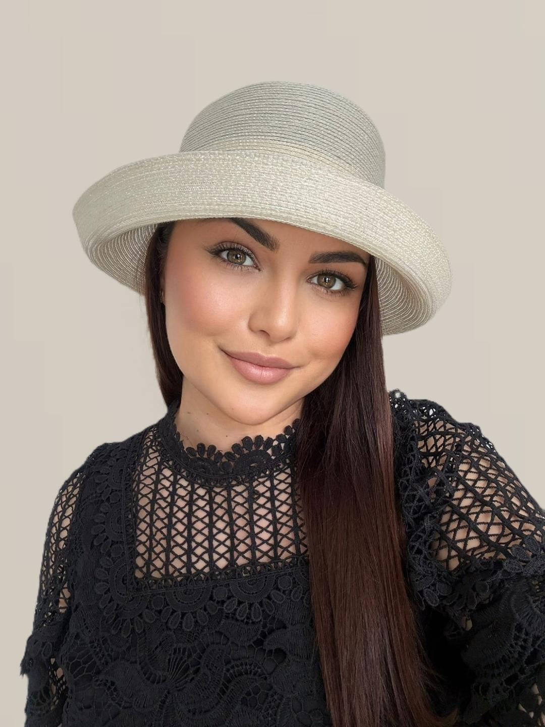 Si tu te poti bucura de o palarie de dama deosebit de eleganta alegand noul model de palarie de soare Amira Lux, o palarie de vara din organza usor sidefată cu bor rulat si decor rafinat cu panglica si funda din acelasi material, un accesoriu ce va da o nota aparte de stil si eleganta tinutelor tale de fiecare zi - marime unica, reglabila