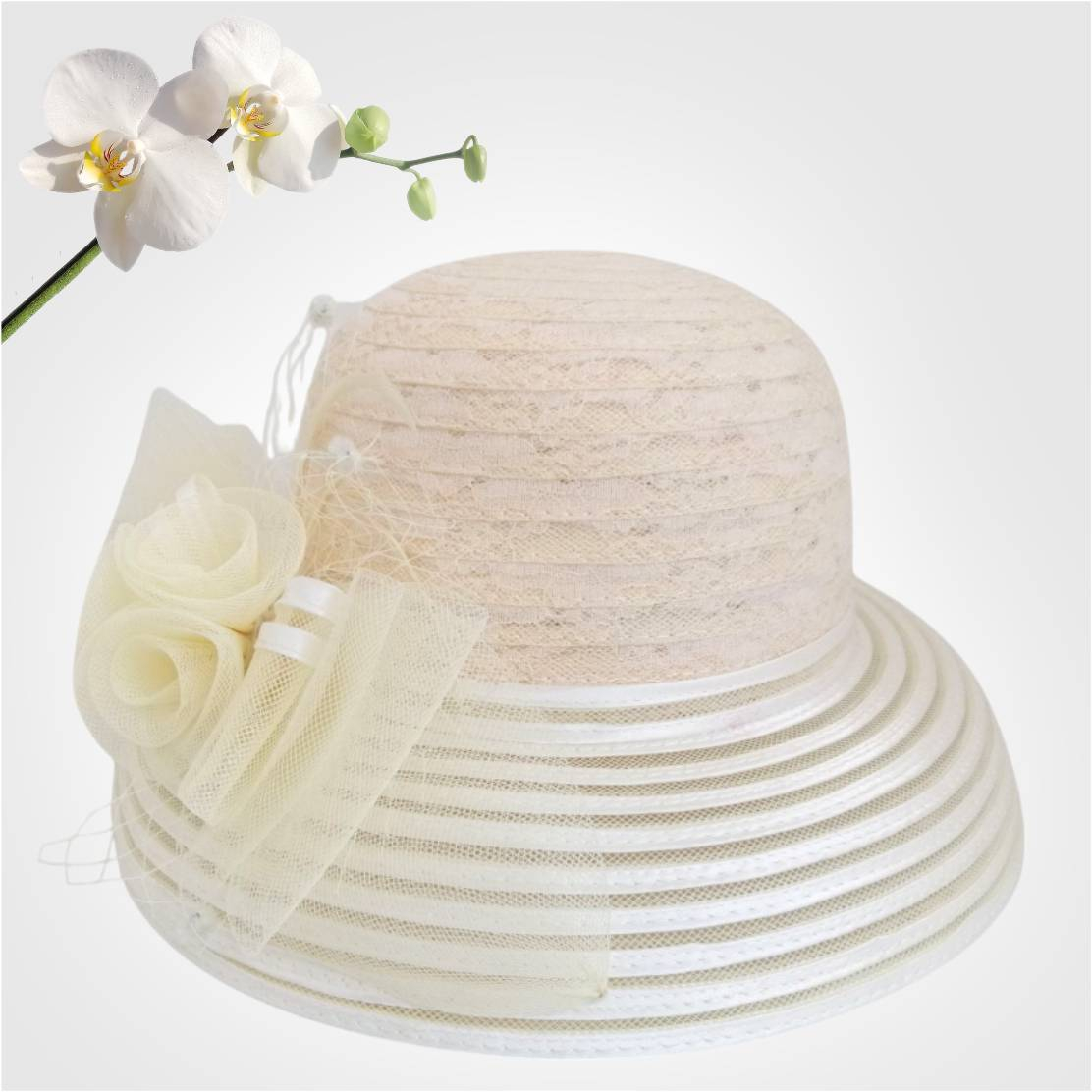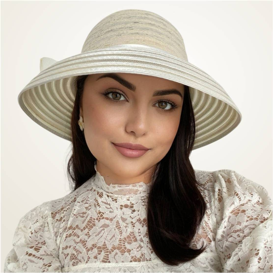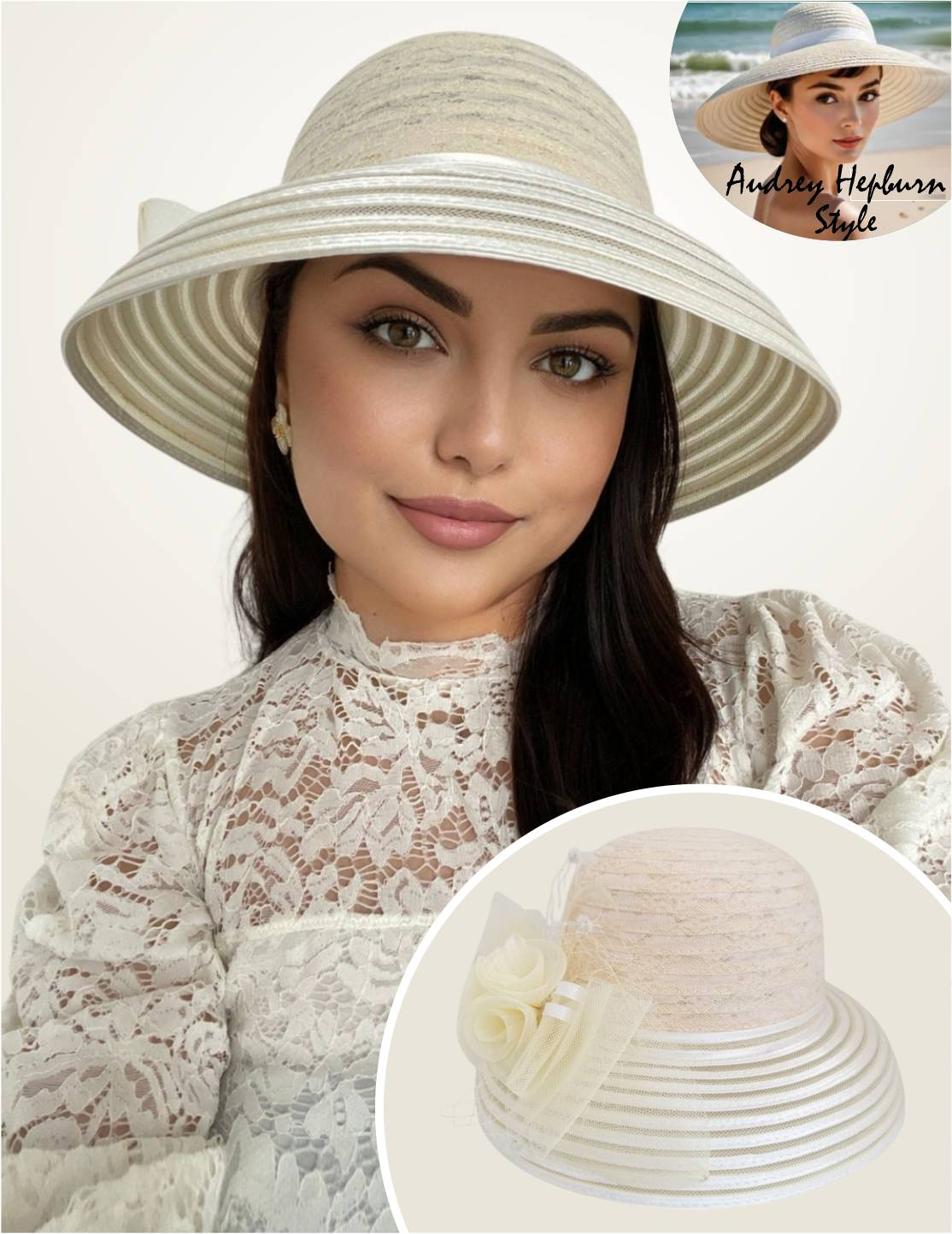 Si tu te poti bucura de o palarie de dama eleganta, alegand noul model Audrey Lux, o palarie de soare de un rafinament aparte din organza satinata si dantela, diponibila in culori distinse, cu boruri rotunde si generoase si decor luxuriant cu frunda - o palarie potrivita atat pentru tinute de zi, cat si pentru tinute de ocazie sau de vacanta - marime UNICA, reglabila