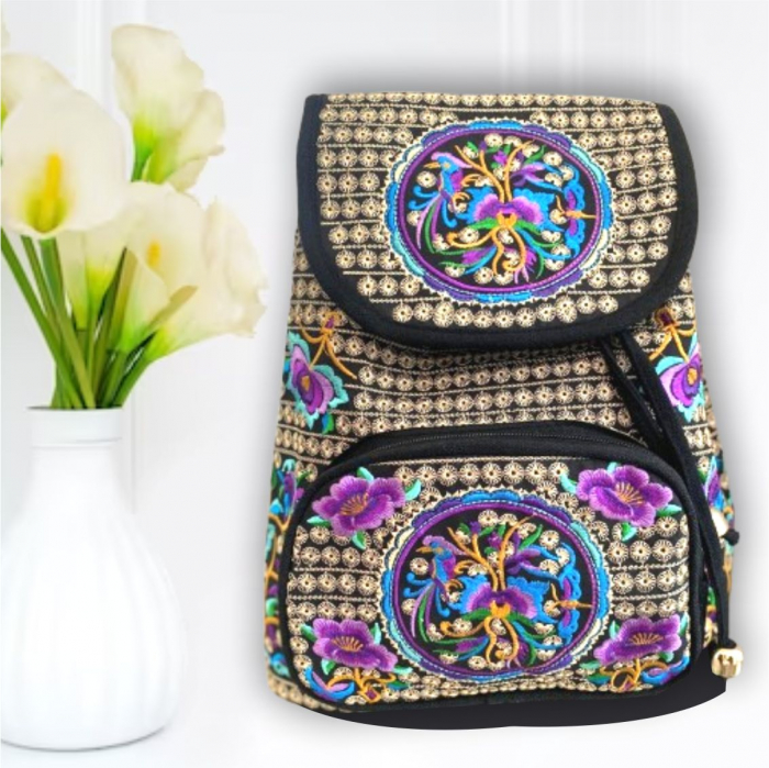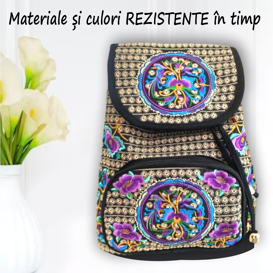 - Model: rucsac de dama cu motive etnice in culori vii - nuante de rosu si roz
