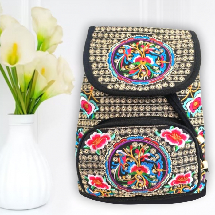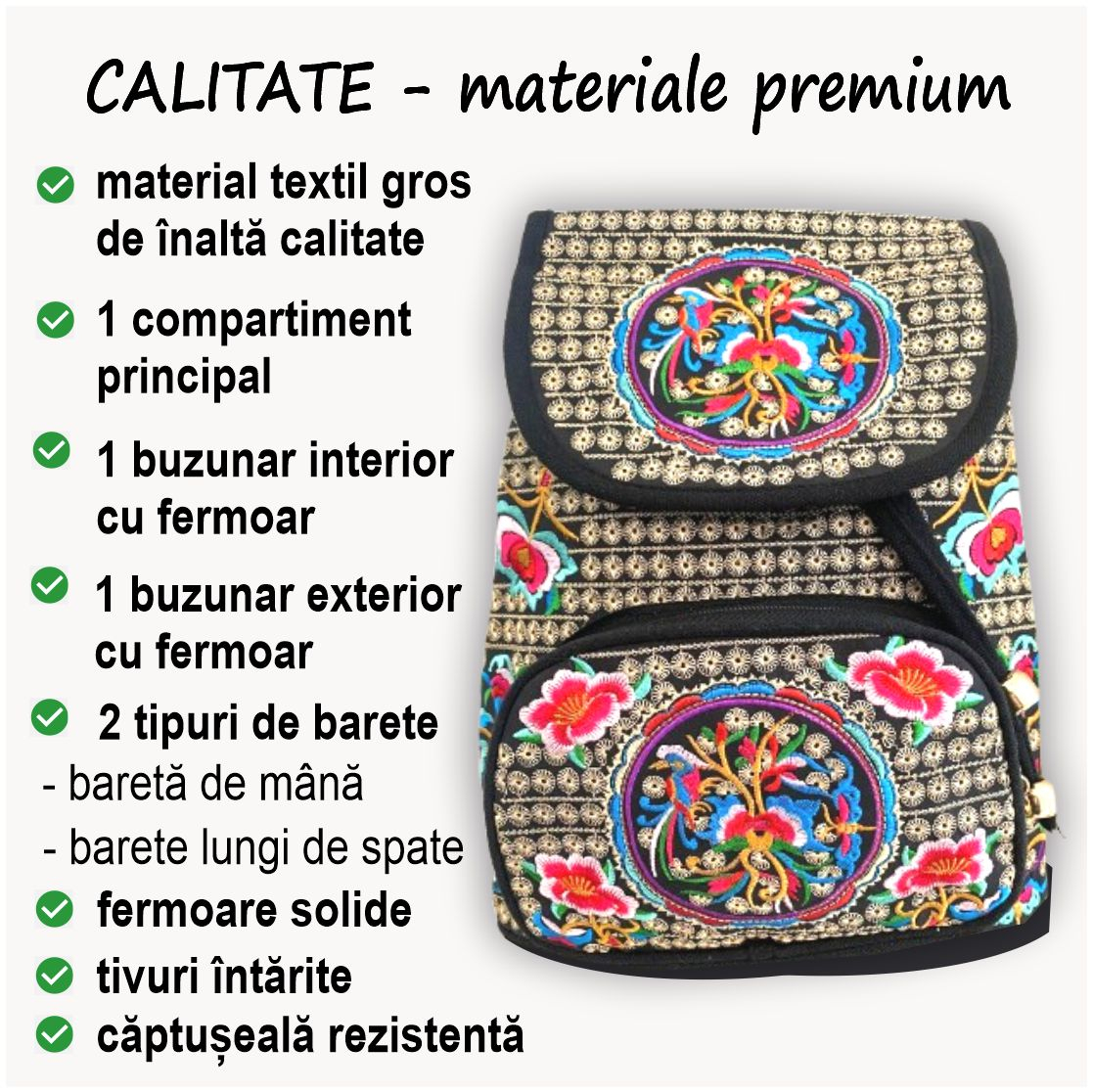 - Model: rucsac de dama cu motive etnice in culori vii - nuante de rosu si roz