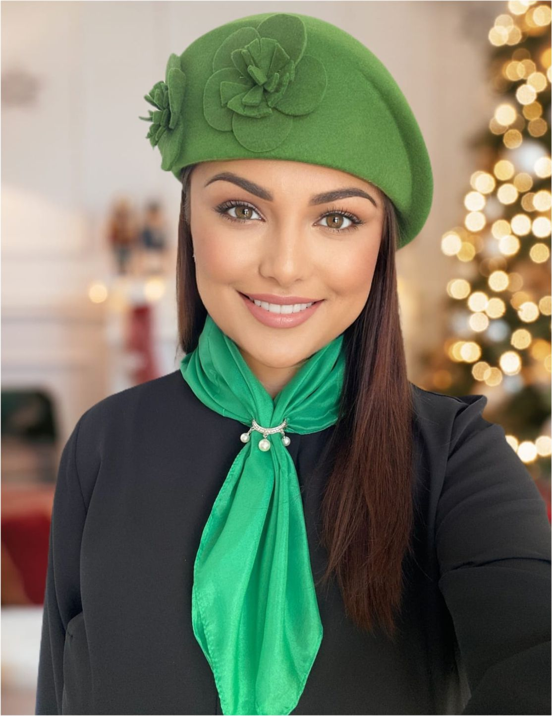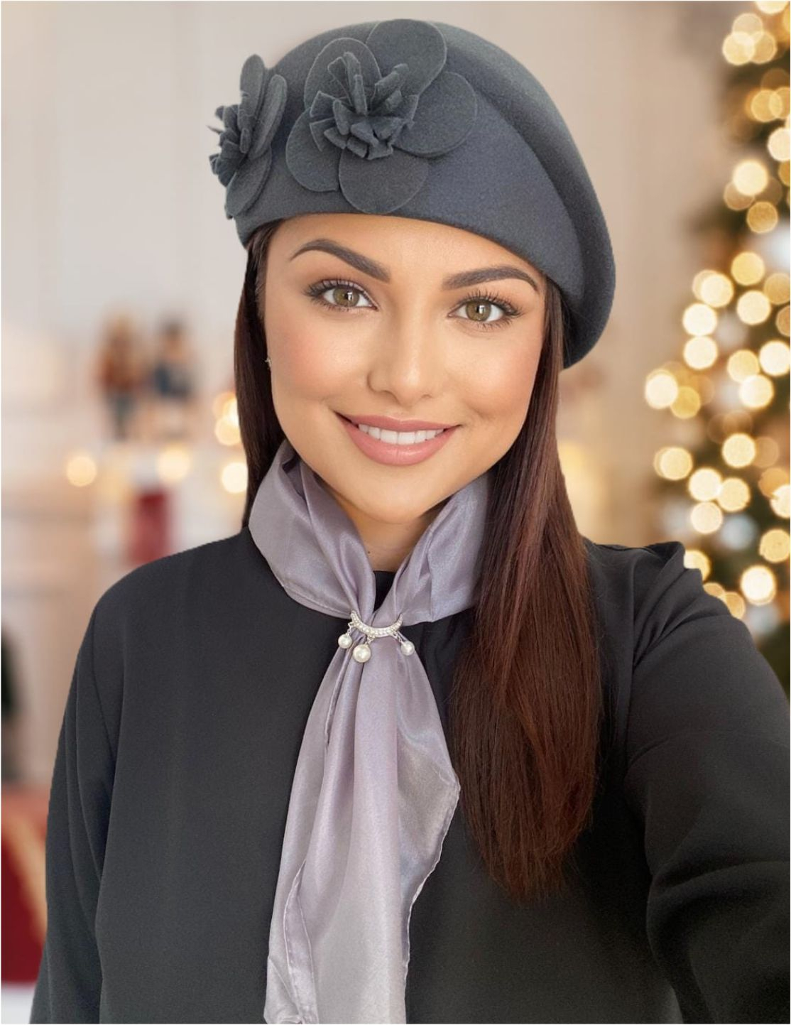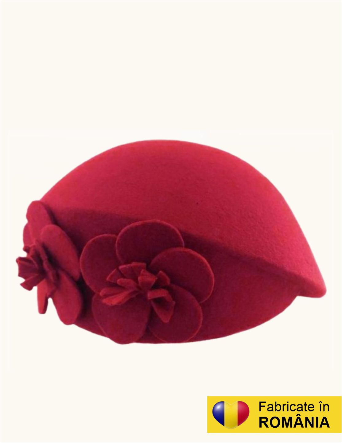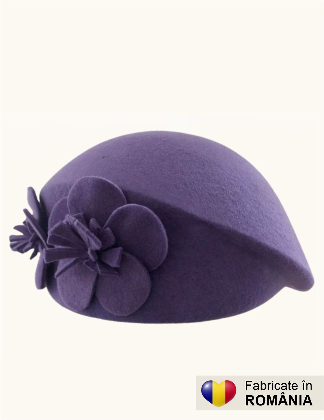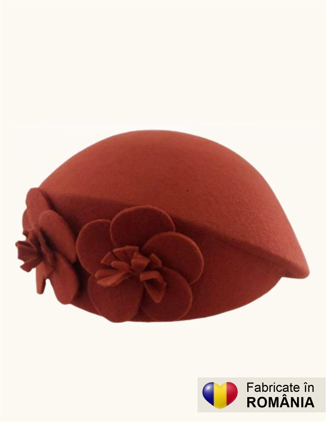 • MODEL: palarie dama tip toca cu croiala moderna pe colt si delicate accesorii florale