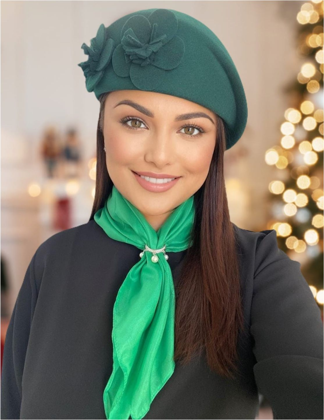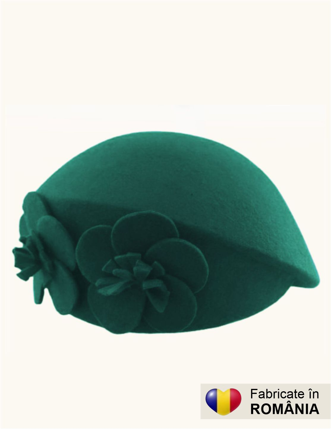 • MODEL: palarie dama tip toca cu croiala moderna pe colt si delicate accesorii florale